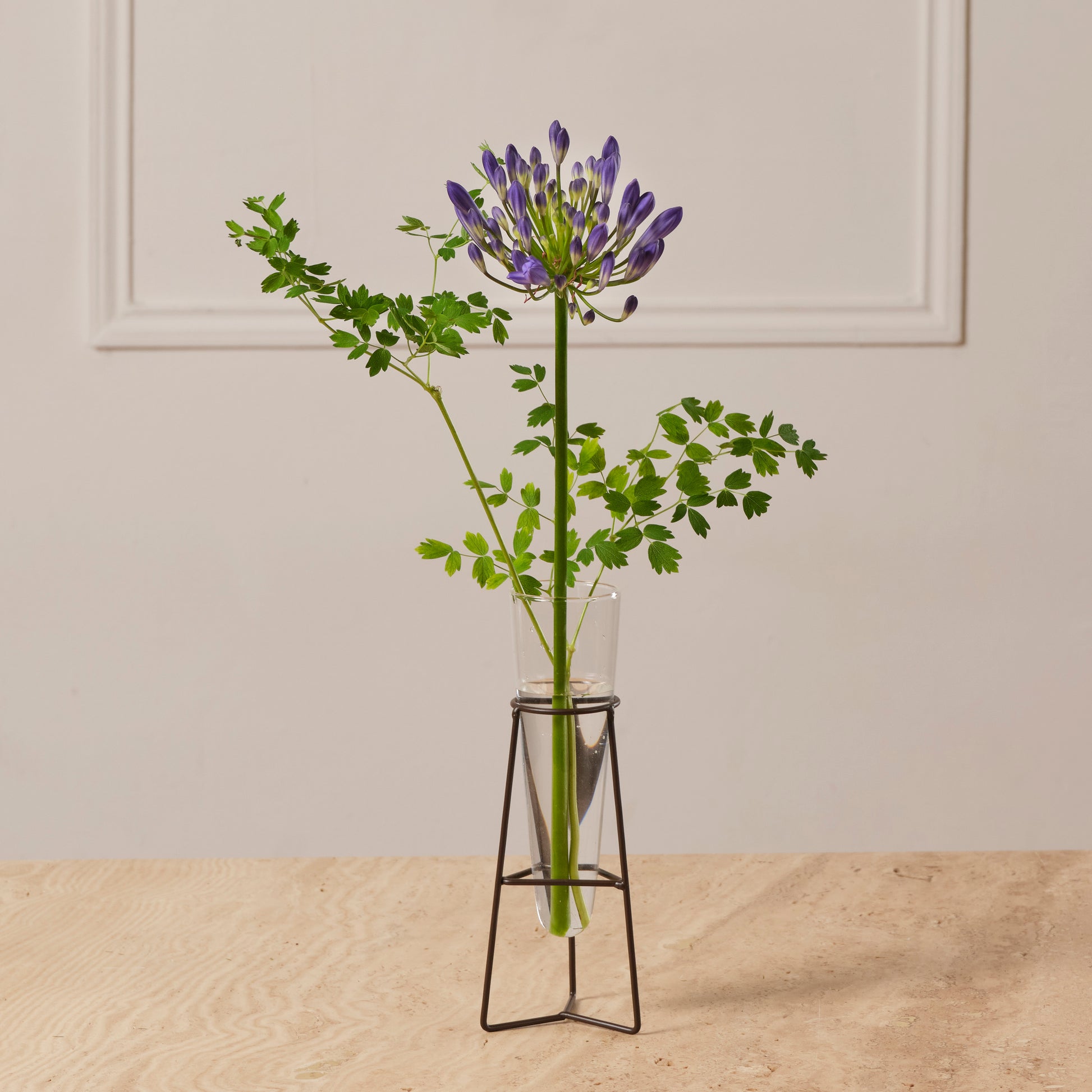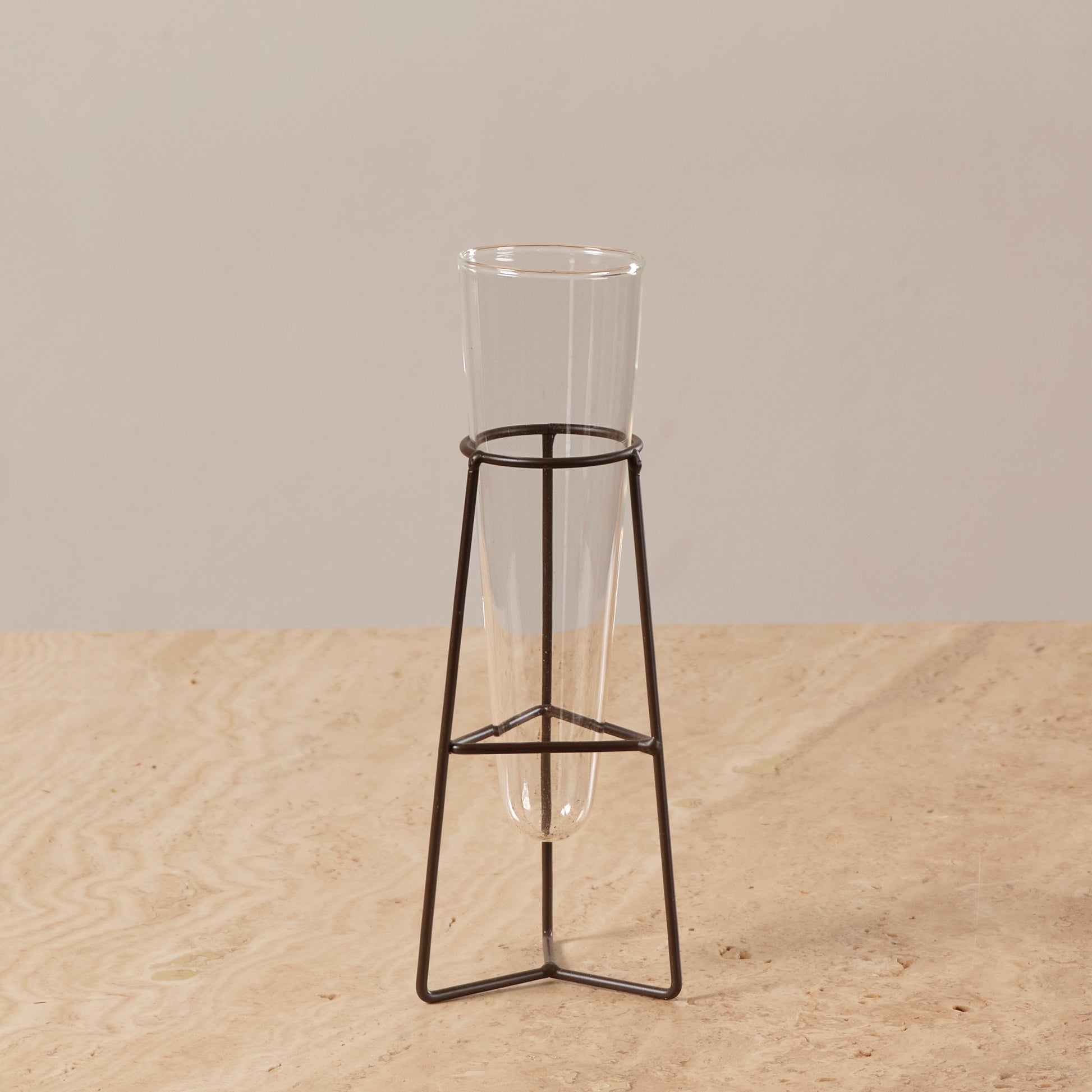 This minimalist flower vase features a clear glass tube held within a sleek metal frame, creating a light and architectural silhouette. Its simple yet modern design highlights the natural beauty of a single stem or a small arrangement.